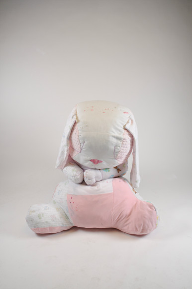 Bunny was hand-sewn from thrifted baby-blankets and hand-me-down embroidery thread, and materialized based on a sentimental object of my own. The labour and process of creation was both tedious and meditational. His creation took time, but even more-so energy, specifically physical energy rather than emotional or mental. This allowed my process to act as a way to break away from the stress of other daily routines and responsibilities. In many respects Bunny works as a therapeutic art-piece, meant to give comfort. His presence is meant to be generous to the viewer.